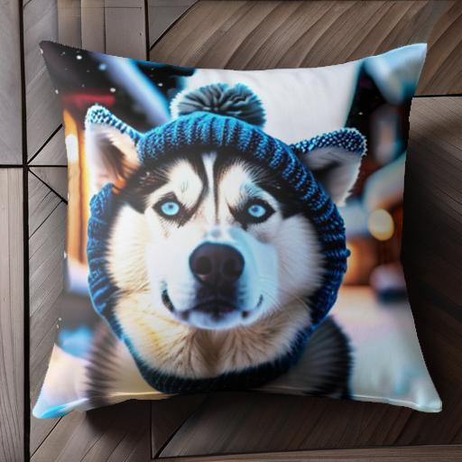 ニット帽 シベリアンハスキー 冬 雪 クッションカバー 45×45cm アニマル柄 おしゃれ 可愛い クッション本体付き 正方形 犬ファン