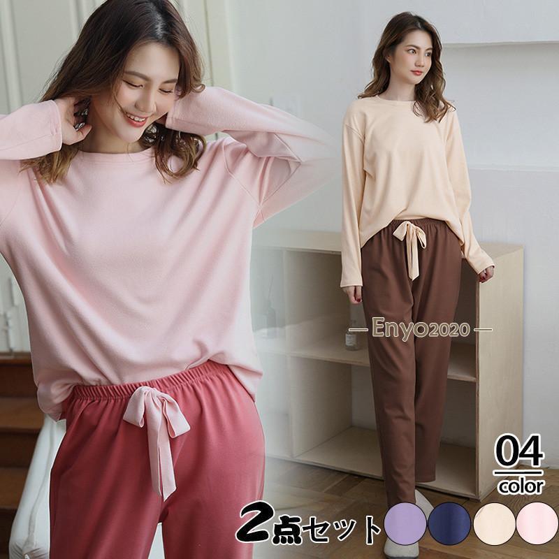 パジャマ レディース ルームウェア 2点セット 長袖 上下セット ラウンドネック 無地 カジュアル ゆったり アウター 可愛い 春秋 リラックス