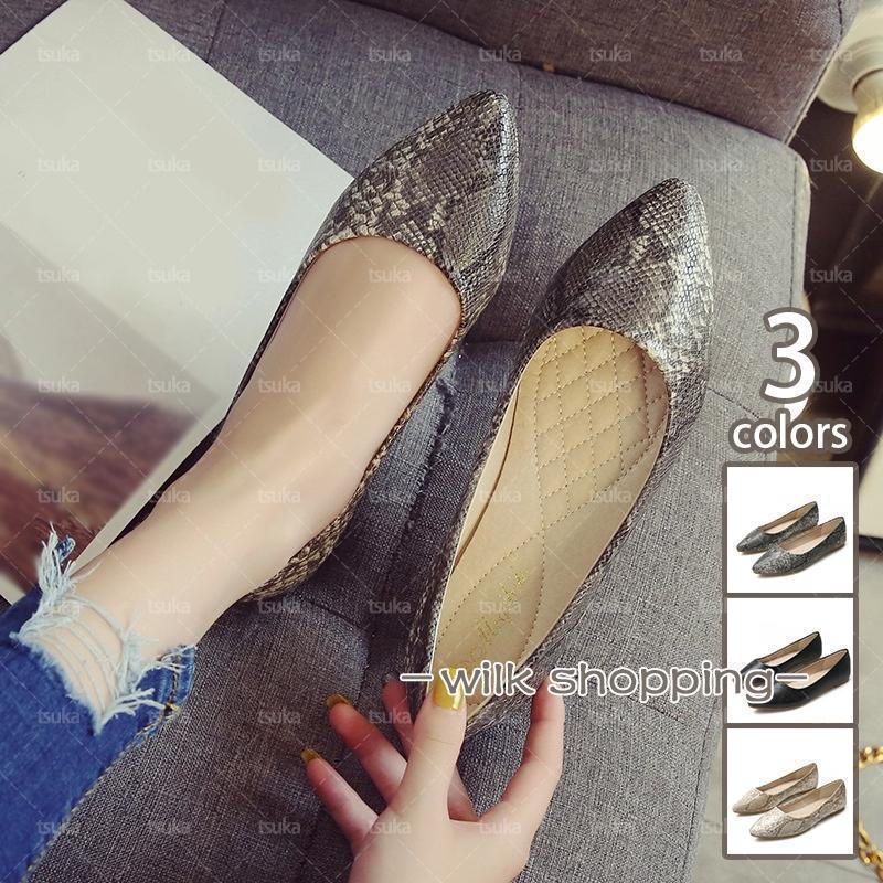 【オープン記念!5%OFFクーポン】パンプス レディース ポインテッドトゥ パイソン柄 履きやすい ヘビ柄 甲浅 軽量 通気性 バレエシューズ ぺたんこ かわいい フラット シューズ ローヒール
