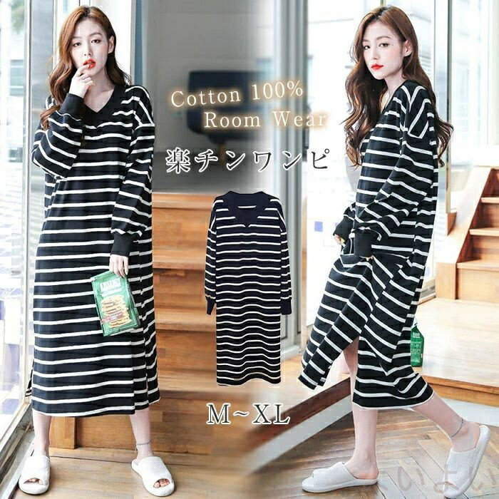 綿100% ルームウェア ネグリジェ ワンピース レディース 秋 長袖 コットン100% パジャマ ナイトウェア ストライプ 部屋着 大人 可愛い 寝巻き