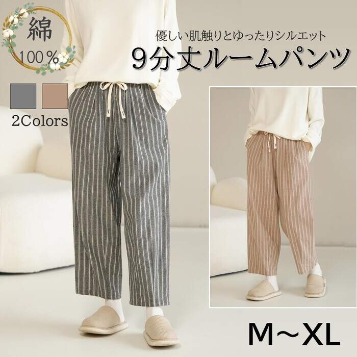 コ ルームウェア ポケット付き ふんわり パジャマ 寝巻き 肌に優しい 柔らかい 9分丈 ゆったり 綿100% ストライプ ルームパンツ