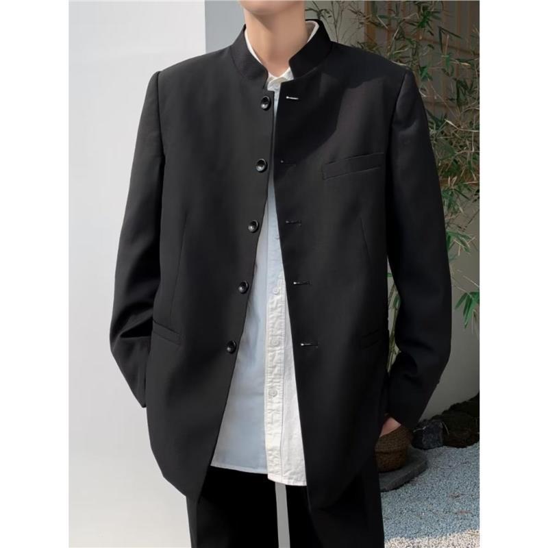 ジャケット メンズ 男性用 高級感 スタイリッシュ 中国風 中山服 立襟 一ツボタン コーデュロイ 麻混 セットアップ ゆったり カジュアル スーツ アウター 秋冬 ブラック
