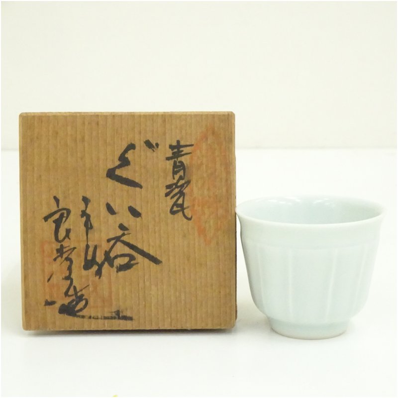 【中古】【陶芸・陶器】良孝造 青磁ぐい呑(共箱)ぐい呑み ぐい飲み おしゃれ かわいい 器 酒器 骨董 食器 ディスプレイ インテリア お酒 居酒屋