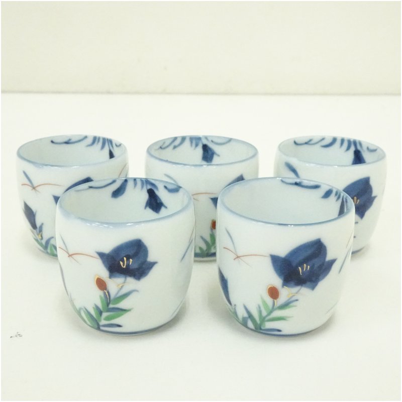 【中古】【陶芸・陶器】有田焼 孝山造 桔梗文ぐい呑5客ぐい呑み ぐい飲み おしゃれ かわいい 器 酒器 骨董 食器 ディスプレイ インテリア お酒 居酒屋