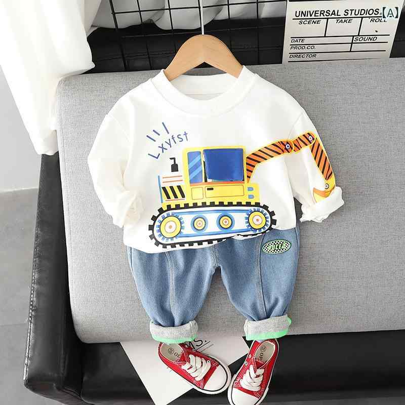 2点セット キッズ 男の子 ベビー ショベルカー柄 長袖 スウェット トレーナー カジュアル デニムパンツ ジーンズ 普段使い お出かけ 通園 綿混 柔らか 秋冬 韓国風