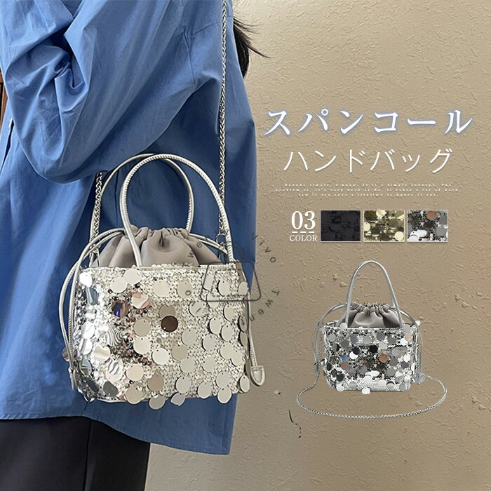 スパンコールバッグ レディース ハンドバッグ スパンコール 2wayバッグ 斜め掛け 手提げ パーティーバッグ キラキラ バッグ チェーン ショルダー ドローストリング 巾着 おしゃれ 可愛い パーティー お呼ばれ 大人 女性 鞄 フェミニン シルバー 送料無料