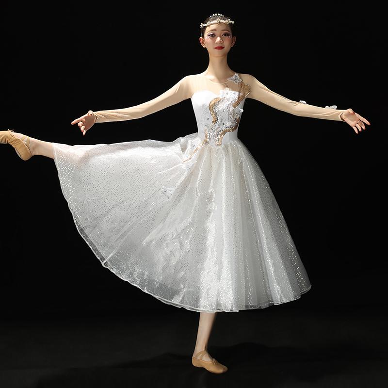 ダンス 衣装 民族舞踊 エスニック ドレス 白 モダン コーラス ロング スカート 大振り スカート オープニングダンス 曲 ダンス パフォーマンス 婦人 ドレス エレガント 舞踊