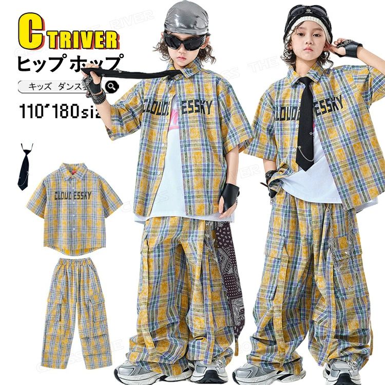チェック柄 ダンス衣装 キッズ セットアップ 半袖 シャツ チェック柄 パンツ カーゴパンツ tシャツ かっこいい ゆったり 韓国 k-pop 衣装 キッズ ダンス服 ユニセックス ヒップホップ ジャズ チアダンス ステージ衣装 発表会 HIPHOP 演出 イベント 応援団 110 180