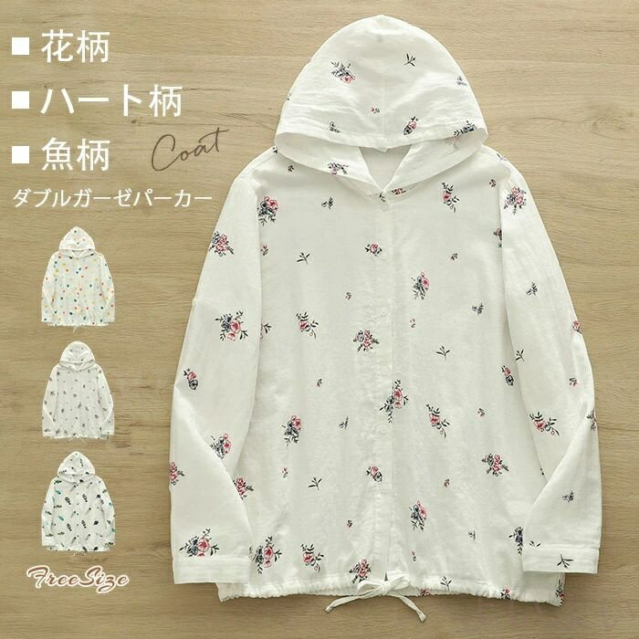 パーカー ガーゼ レディース 花柄 ハート柄 魚柄 長袖 夏 ダブルガーゼ パーカー ボタン ガーゼパーカー ガーゼカーディガン 前開き フード トップス