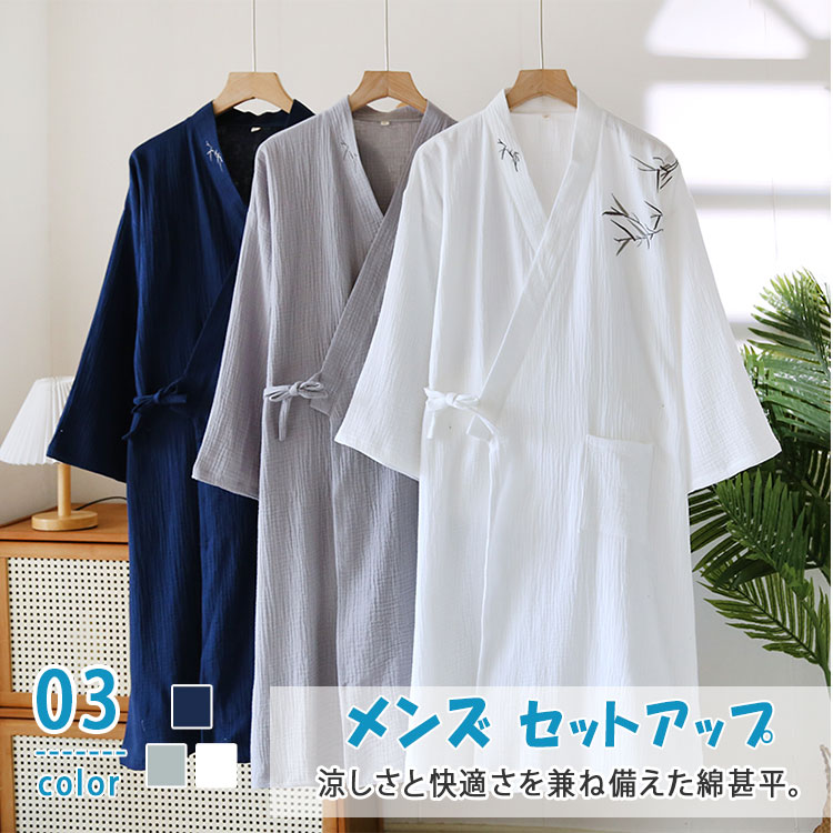 パジャマ 寝巻き ルームウェア 甚平 メンズ ロング丈 綿 ダブルガーゼ 薄手 涼しい 七分袖 紐付き 羽織 ガウン 浴衣風 刺繍竹柄
