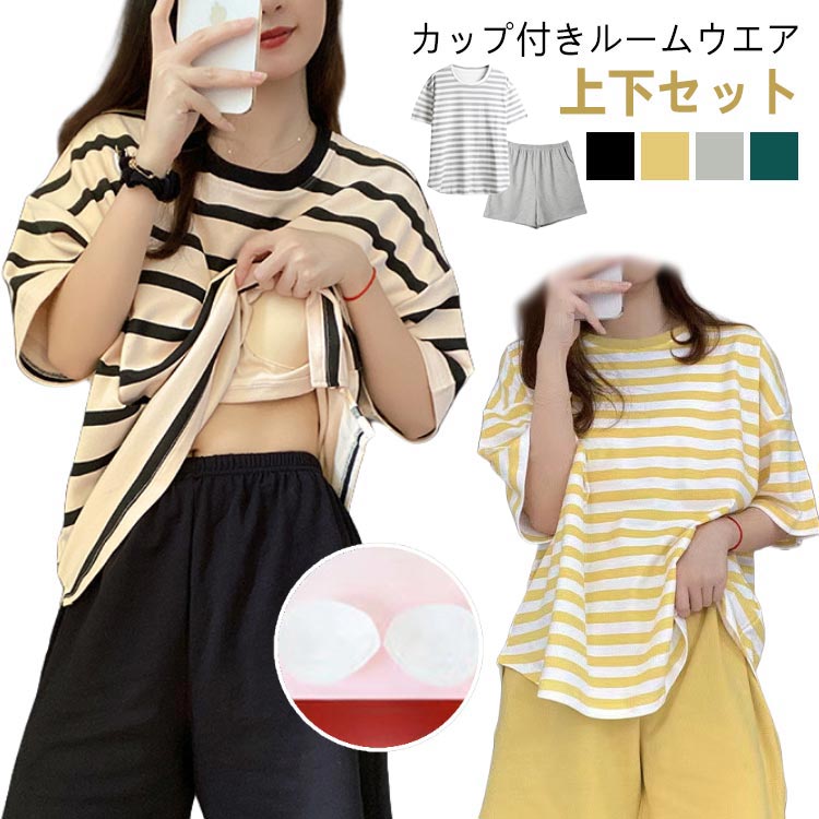 トップス 上下セット ルームウェア パジャマ 半袖 カップ付き カップ付き プルオーバー セットアップ 薄手 部屋着 大きいサイズ 可愛い ストライプ柄 カットソー 半袖tシャツ 半袖 レディース 半パン ウエストゴム 修学旅行 ショートパンツ