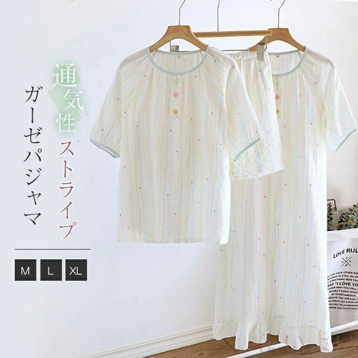 ダブルガーゼ 2重ガーゼ パジャマ レディース ハート柄 ストライプ 夏 ガーゼ ルームウェア 半袖 トップス ワンピース 部屋着 セットアップ 2点セット 寝間着
