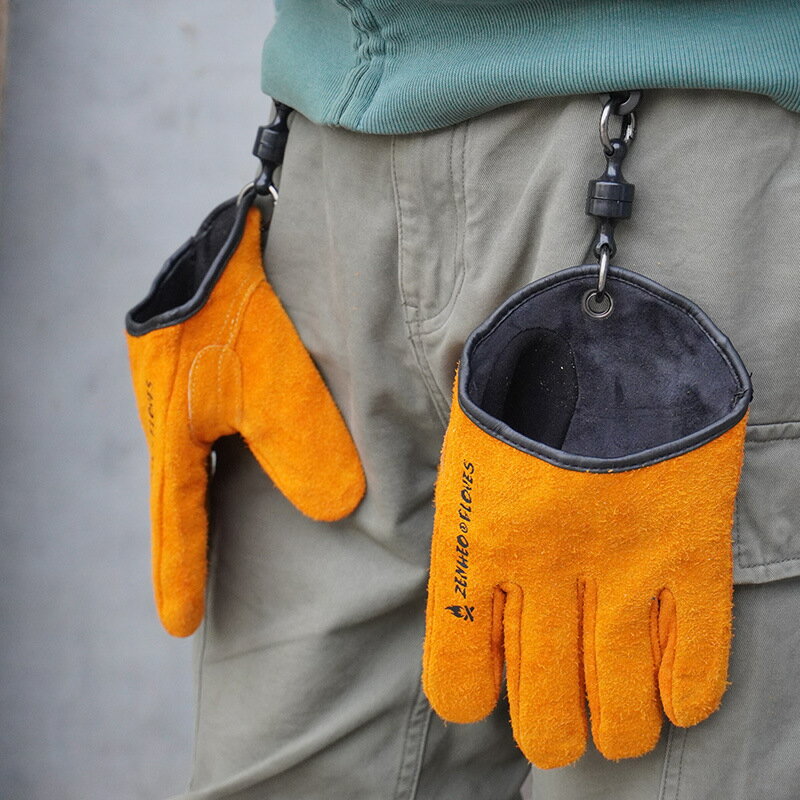 レザーグローブ クイック焚き火グローブ ブラック サイズ(mm):本体全長約208 カラビナ&マグネット部長さ約120 手のひら周り約265 中指長さ約95 重量:約200g / 双キャンプ 焚き火 グローブ 手袋 作業 本革 革 クイック焚き火グローブ 焚火 手袋 サバイバル 火起こし