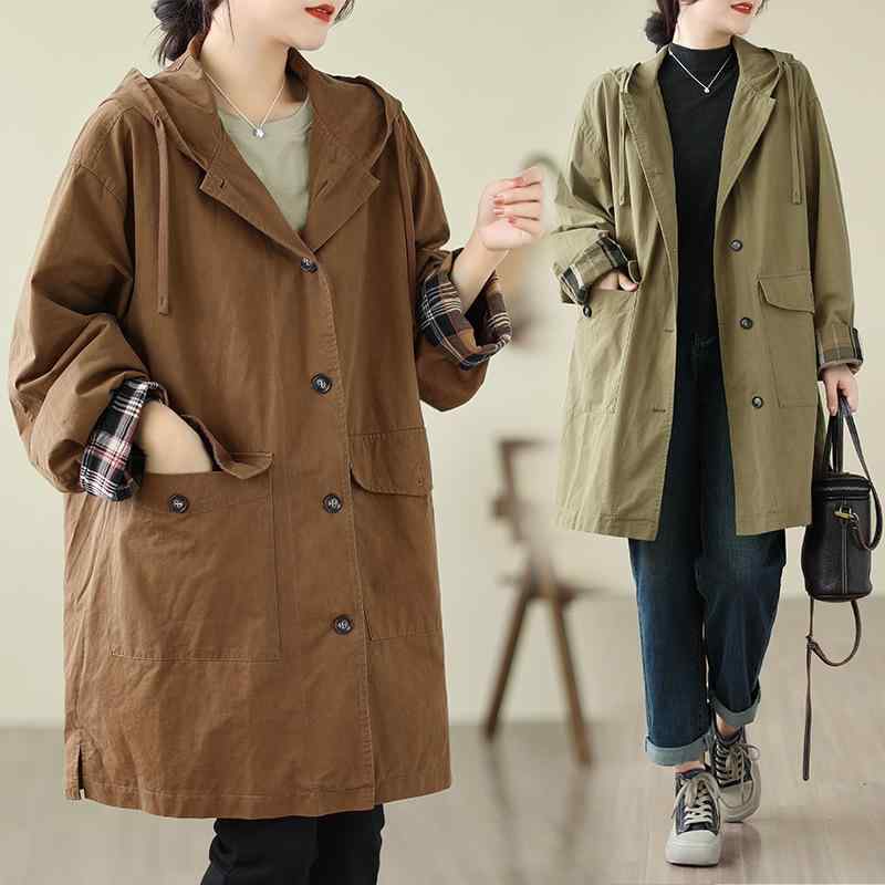 コート レディース 秋冬 中長丈 フード付き ワーク風 ゆったり アウター カーキ 焦糖色 綿 ポリエステル