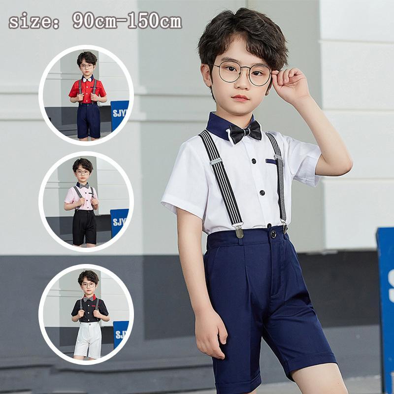 子供スーツ 半袖 4点セット サスペンダー 半ズボン シャツ ブルー グレー ピンク 発表会 スーツ 男の子 キッズ フォーマル 子供服