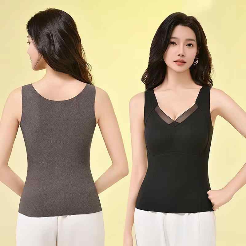 レディースインナー 秋冬 Vネック 裏起毛 あったか 防寒 ノースリーブ トップス 肌色 黒 茶色 グレー(x2)