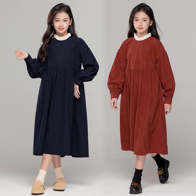 ワンピース 女の子 キッズ 親子お揃い レディース 秋冬 無地 長袖 ゆったり ハイネック ロング丈 韓国風 レトロ コーデュロイ 起毛 裏起毛