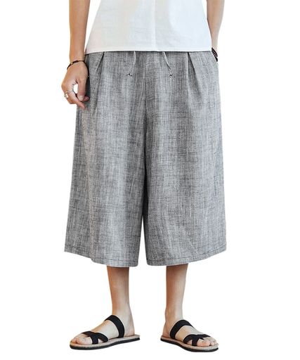 [CEEN]サルエルパンツ七分丈メンズ綿麻リネンストライプ柄ワイドパンツ夏服幅広ゴム調整紐快適部屋着ガウチョパンツハーフパンツゆったり夏ワイドパンツ