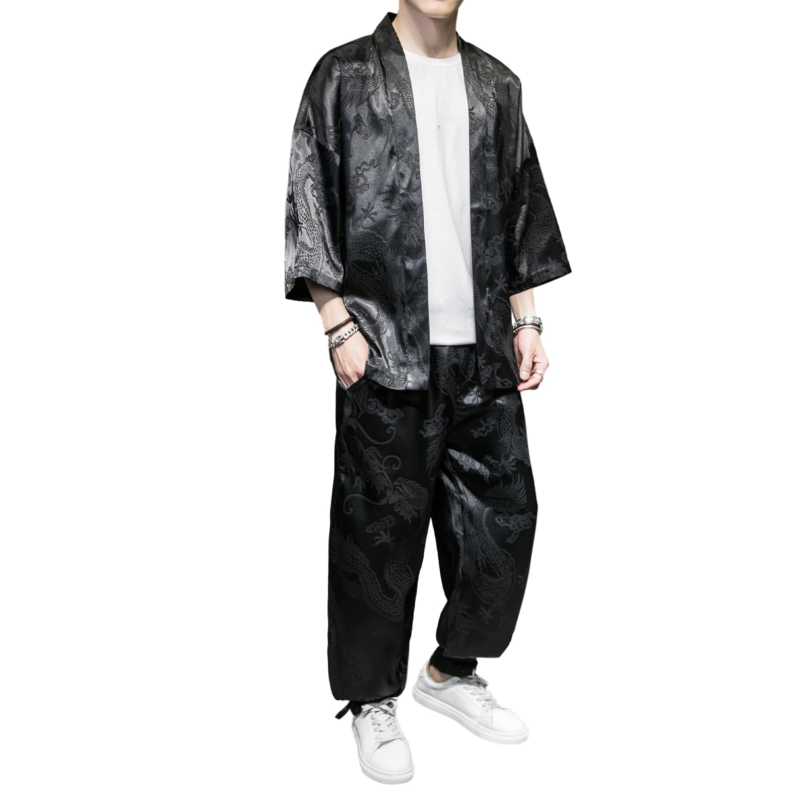 【送料無料】[inotenka] 甚平 メンズ 作務衣 羽織 セットアップ メンズ 上下セット 和風 カジュアル ロング カーディガン 7分袖 ゆったり 薄手 おしゃれ ルームウェア 春夏秋冬 花火大会/祭り/散歩/部屋着 日焼け対策 冷房対策 黒 色:龍柄ブラック、サイズ:XL