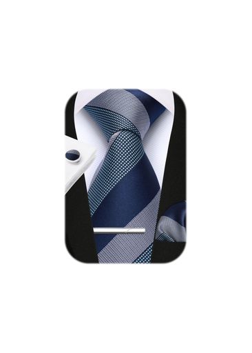 [HISDERN]ネイビーネクタイメンズグレービジネスネクタイチーフタイピンカフスボタン4点セットストライプ柄就活入学式卒業式高級プレゼントブラント品A4-01