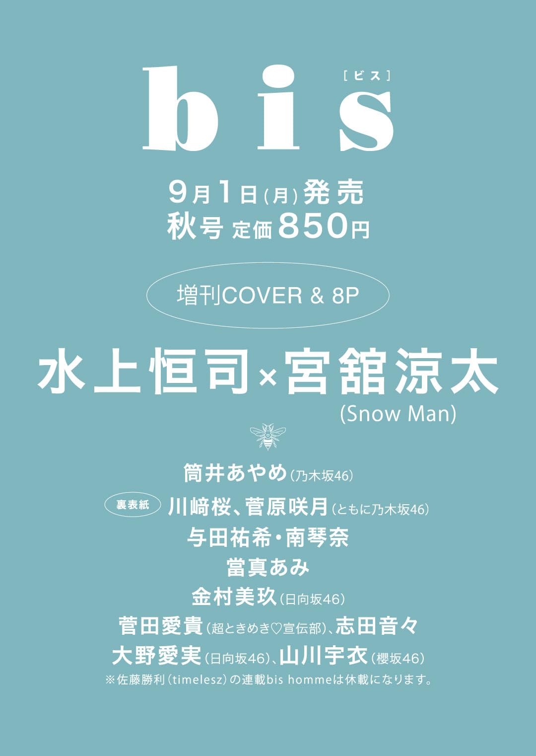 bis(ビス)2025年秋号増刊 表紙 水上恒司 Snow Man宮舘涼太 裏表紙乃木坂46 川〓桜&菅原咲月
